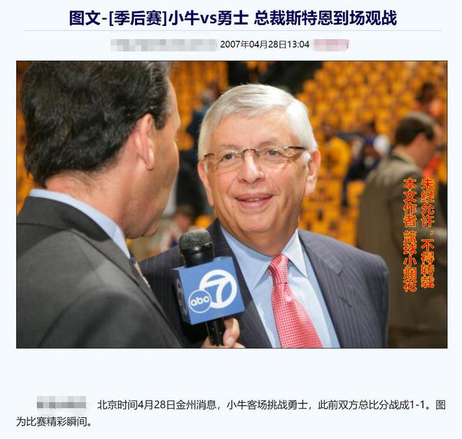 NBA总裁大卫-斯特恩在诸多更加激烈的系列赛中,选择亲临甲骨文现场,并且在赛前接受采访,把勇士管理层,老尼尔森,勇士球员以及勇士球迷好一顿夸,他这个意思,可能啊,我猜测是为了缓和和稀释系列赛第二战疑似吹偏哨的事实,安抚勇士人员的情绪……